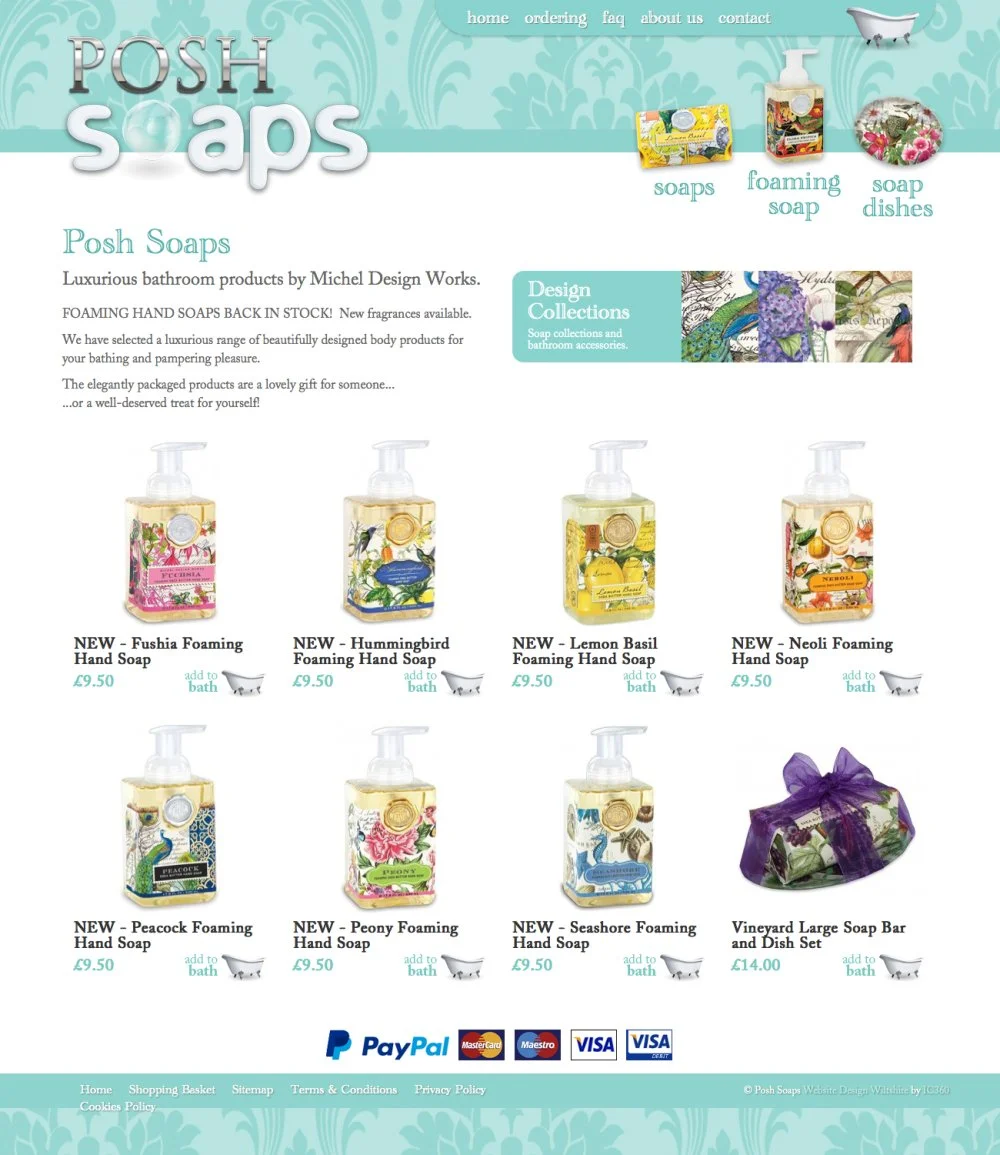 The idea was make “Posh” look posh, and the word “Soaps” look soapy. So we opted for a style of lettering that was reminiscent of old bathroom chrome taps and bath fittings. Coupled with a rounded white soft adaptation of another font, to make soapy lettering.